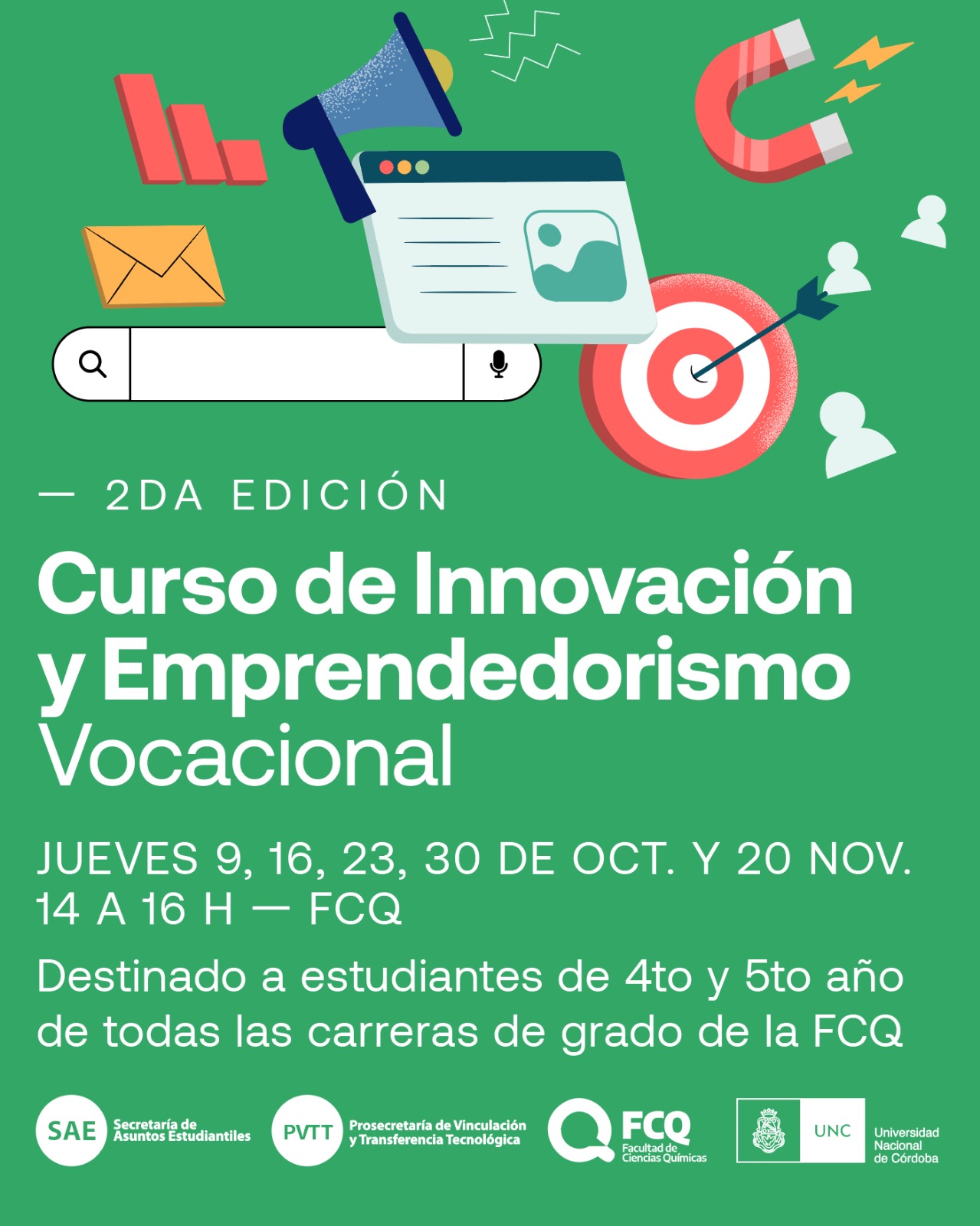 Docentes investigadores de la Facultad, En el mes de octubre se dicta el curso Innovación y Emprendedorismo destinado a estudiantes de 4to y 5to año de las 4 carreras de la Facultad. Se trata de la segunda edición (la primera fue en 2023). Les dejo la información para el caso que la quieran compartir entre sus estudiantes. Gracias, saludos! Cecilia ******************************************************************************* *¿Querés transformar tus ideas en proyectos con impacto social y productivo? * Sumate al curso " INNOVACIÓN y EMPRENDEDORISMO" ✨ - CURSO VOCACIONAL ⏰ Comienza el JUEVES 9/10*, de 14 a 16 h* 📍 *Auditorio del Ciencias 1* - Facultad de Ciencias Químicas - UNC 📆 *Programa de capacitaciones:* 1️⃣09/10: *Innovación:* ¿De qué se trata? ¿Cómo innovar? Ecosistema de innovación 2️⃣16/10: *Validación: *Validación: Análisis de la tecnología y análisis de sus adoptantes 3️⃣23/10: *Creación:* ¿Qué es una start up científicas basadas en conocimiento? Deep tech y otros conceptos 4️⃣30/10: *Mercadeo:* ¿Cómo posicionar el producto en el mercado? 5️⃣20/11: Presentación de Trabajos Prácticos de participantes. Destinado a estudiantes de 4° y 5° año de las cuatro carreras de la Facultad de Ciencias Químicas, Universidad Nacional de Córdoba. Por consultas, contactarse a transferenciatecnologica@quimicas.unc.edu.ar [image: Flyer.jpeg] ********************************************************** – Dra. Ma. Cecilia Gaggiotti Prosecretaria de Vinculación y Transferencia Tecnológica Docente Facultad de Ciencias Químicas <https://www.fcq.unc.edu.ar/vinculacion> - UNC Edificio Integrador, Planta Baja. Tel. 54 351-535-3850 (Interno: 55447) E-mail: transferenciatecnologica@quimicas.unc.edu.ar - cecilia.gaggiotti@unc.edu.ar Web FCQ: www.fcq.unc.edu.ar/valorizacion Linkedin: linkedin.com/in/ceciliagaggiotti <http://www.linkedin.com/in/ceciliagaggiotti> [image: image.png]