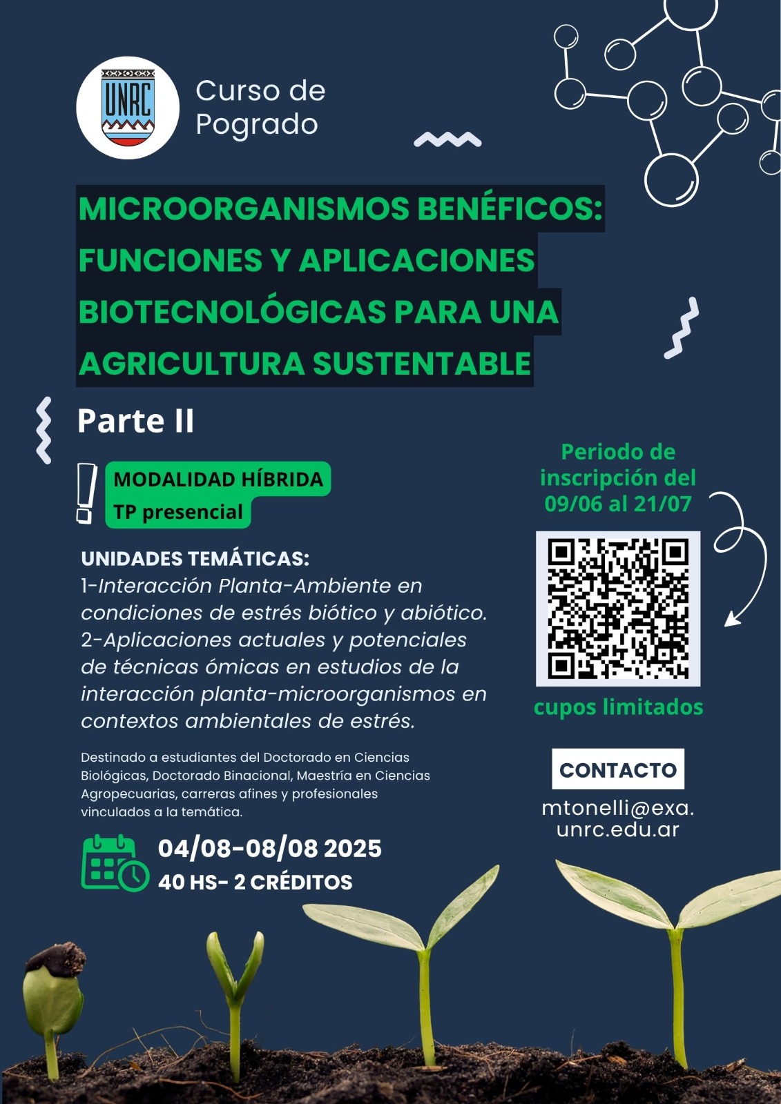 Estimados socios: Enviamos información sobre el curso de posgrado: “MICROORGANISMOS BENÉFICOS: FUNCIONES Y APLICACIONES BIOTECNOLÓGICAS PARA UNA AGRICULTURA SUSTENTABLE. PARTE II”. El mismo es de Modalidad híbrida. TP presencial (7 y 8 de Agosto) UNRC. Se adjunta flyer. Saludos cordiales Secretaría SAIB Para difundir información a la lista: https://forms.gle/TeMRAKptPMkrBUgf8