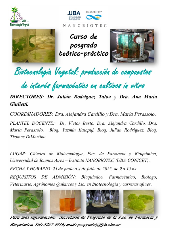 Enviamos información sobre un curso de posgrado. El mismo tiene como objetivo que el profesional se instruya en el cultivo in vitro de plantas para la producción de metabolitos secundarios. En este curso se formará sobre diferentes estrategias para optimizar sistemas de producción y escalado en Biorreactores. Se adjunta flyer. Saludos cordiales Secretaría SAIB Para difundir información a la lista: https://forms.gle/TeMRAKptPMkrBUgf8