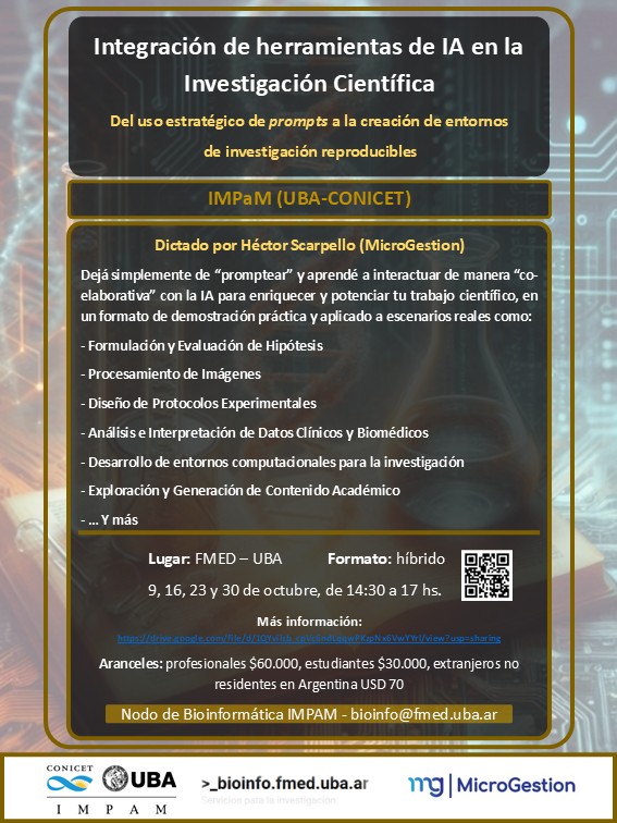 Adjunto información enviada por la Dra. Daniela Centrón de un curso que se realizará en el IMPAM-CONICET de la Facultad de Medicina de la UBA sobre Inteligencia Artificial de forma híbrida, especial para investigadores y becarios. Saludos, Andrea [image: WhatsApp Image 2025-09-26 at 5.56.22 PM.jpeg] ***************************************************************************** *Prof. Dra. Andrea M. Smania* CIQUIBIC CONICET Dpto. Química Biológica Ranwel Caputto Facultad de Ciencias Químicas Universidad Nacional de Córdoba Haya de la Torre s/n Ciudad Universitaria X5000HUA, Córdoba, Argentina phone: +54-351-535-3855